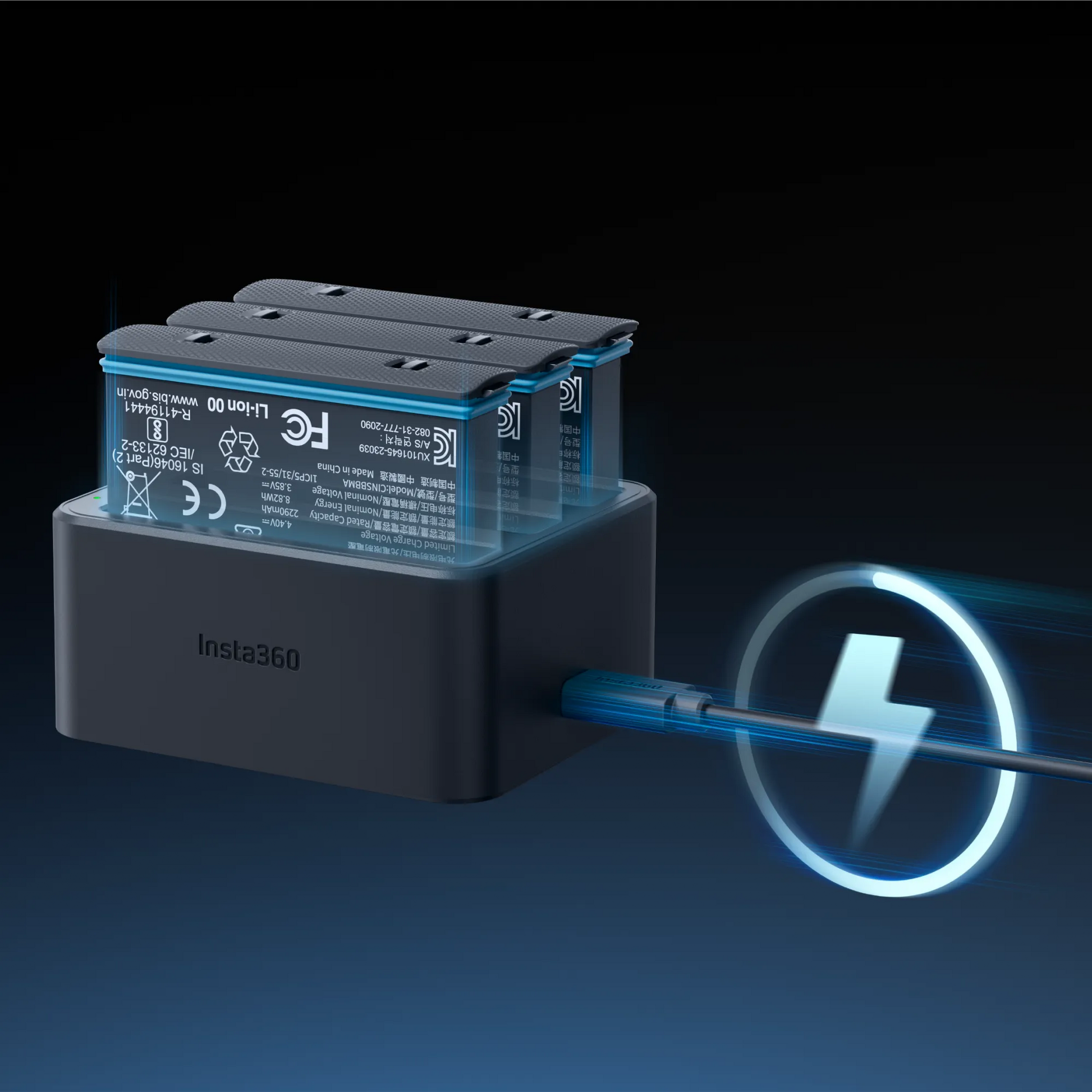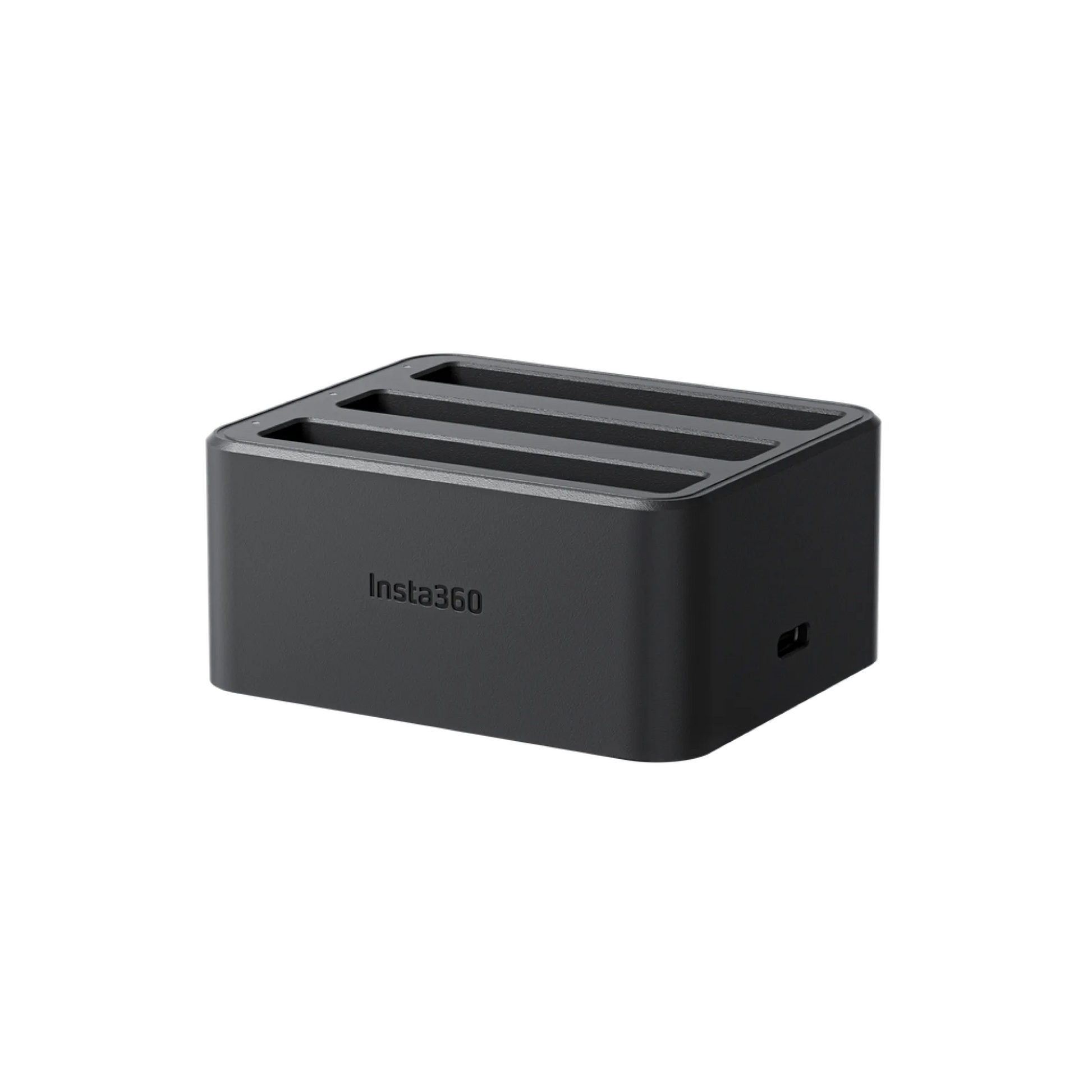 Nabíjecí hub pro tři baterie pro kameru Insta360 X4. Hub nabije 2290 mAh akumulátor za 43 minut (za 26 minut na 80%).