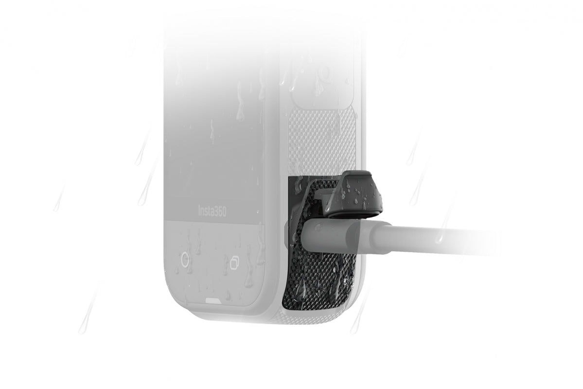 Insta360 X5 All-Weather krytka USB portu umožňuje díky certifikaci IPX4 nabíjení kamery i za deště nebo sněžení, čímž zajišťuje ochranu proti stříkající vodě.